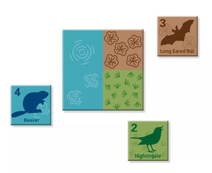 Each tile has 4 areas featuring 3 types of habitat: woodland, scrubland and wetland. The tokens represent wildlife of different habitats and values.